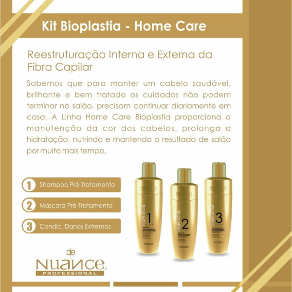 Sabemos que para manter um cabelo saudável, brilhante e bem tratado os cuidados não podem terminar no salão, precisam continuar diariamente em casa. A Linha Home Care Bioplastia Capilar proporciona manutenção da cor, prolonga a hidratação, nutrindo e mantendo o resultado de salão por muito mais tempo.