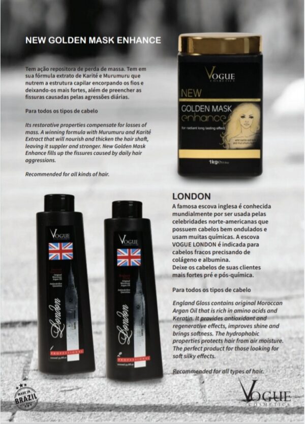 Modo de Uso: Aplique o London England Gloss como o auxílio de um pincel e pente fino em todo o cabelo começando pela nuca. Depois faça uma escova bem lisa, em seguida passe a prancha em mechas finas 8 vezes em cada mecha a temperatura de 200º a 230º graus.