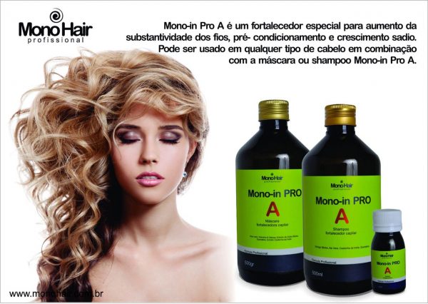 Creme sem enxague Mono-in Pro A – O Leave-in Mono-in Pro A é um excelente tratamento especial para aumento da substantividade dos fios, condicionamento e crescimento sadio. Dentre outros ativos conta ainda com: Extrato de Alecrim, Aloe Vera, Vitamina A Oleosa, Extrato de Ginko Biloba, Queratina , Extrato de Castanha da índia. Pode Ser usado em qualquer tipo de cabelo.