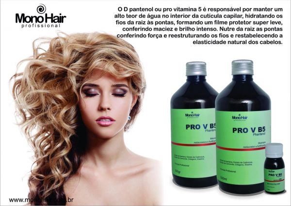 Creme sem Enxague Mono in Pro A – O Leave-in Pro V B5 Pantenol ou Pro vitamina 5 é responsável por manter um alto teor de água no interior da cutícula capilar.Conferindo força ,maciez e brilho intenso. Nutre da raiz as pontas conferindo força e reestruturando os fios e restabelecendo a elasticidade natural dos cabelos.