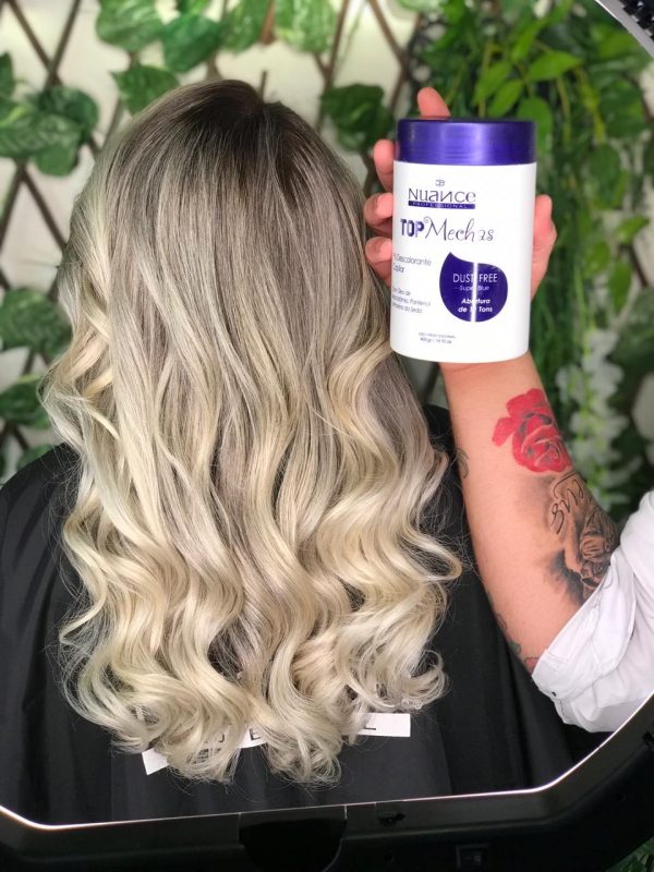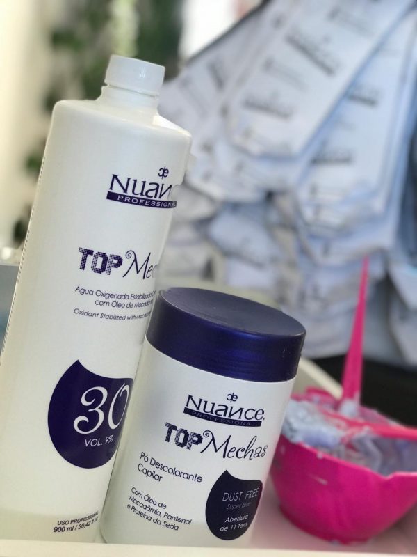 Com a possibilidade de criar tons e efeitos personalizados, o Pó Descolorante Top Mechas Dust Free e a Água Oxigenada são indicados para um clareamento rápido e com possibilidade de abertura de até 9 tonalidades.