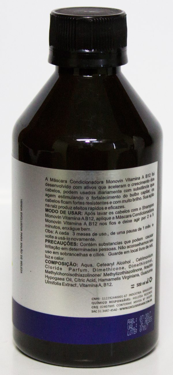 Modo de uso Shampoo /Máscara – Nos Cabelos úmidos aplique uma pequena porção do Shampoo massageie e enxágue, repita o processo e deixe agir por 2 a 5 minutos. Enxáguar bem e aplique a Máscara condicionadora Monovit.A Vitamina A B12 nos fios e diexe agir por 2 a 5 minutos, enxágue bem.