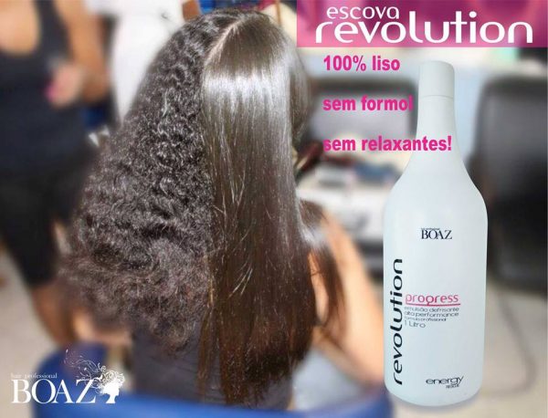 Porém a Revolution Progress é um defrisante de alta performance isento de formol, capaz de tratar e selar profundamente os cabelos proporcionando um efeito liso natural. Restaura os fios e adiciona um brilho intenso, resultando em cabelos lisos, soltos, macios e com naturalidade de movimento. Sua formula contém íons positivos que se atraem ao íons negativos presentes no interior do fio, como um imã, formando ligações magnéticas que mantêm a cutículas firmemente fechadas, dando muito brilho e força para os cabelos. Além disso, Revolution Progress age em todas as camadas do fio deixando os cabelos realmente disciplinados e sem frizz. O aquecimento proporcionado pelo secador e pela prancha aliado a tração mecânica do profissional realinha os fios que foram modificados pela Revolution, trazendo uma nova forma de liso natural. Sua composição com óleos vegetais e aminoácidos trazem inúmeros benefícios à fibra e todo esse processo não plastifica os fios, permitindo que os mesmos sejam hidratados e estilizados normalmente.