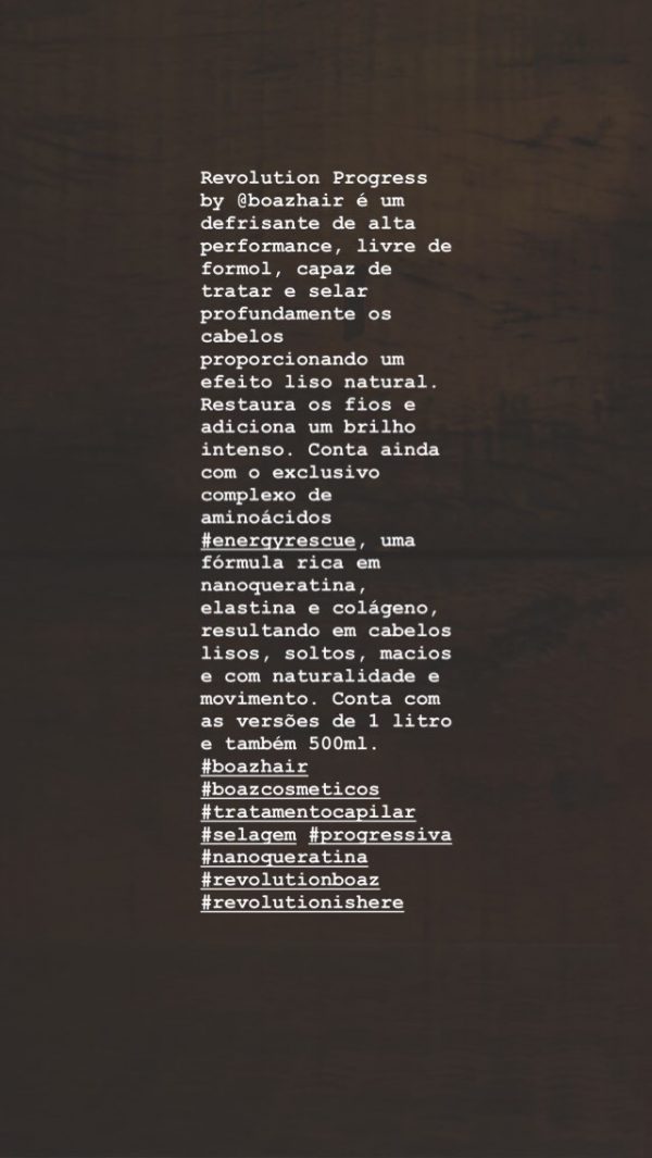 Porém a Revolution Progress é um defrizante de alta performance isento de formol, capaz de tratar e selar profundamente os cabelos proporcionando um efeito liso natural. Restaura os fios e adiciona um brilho intenso, resultando em cabelos lisos, soltos, macios e com naturalidade de movimento. Sua formula contém íons positivos que se atraem ao íons negativos presentes no interior do fio, como um imã, formando ligações magnéticas que mantêm a cutículas firmemente fechadas, dando muito brilho e força para os cabelos. Além disso, Revolution Progress age em todas as camadas do fio deixando os cabelos realmente disciplinados e sem frizz. O aquecimento proporcionado pelo secador e pela prancha aliado a tração mecânica do profissional realinha os fios que foram modificados pela Revolution, trazendo uma nova forma de liso natural. Sua composição com óleos vegetais e aminoácidos trazem inúmeros benefícios à fibra e todo esse processo não plastifica os fios, permitindo que os mesmos sejam hidratados e estilizados normalmente.